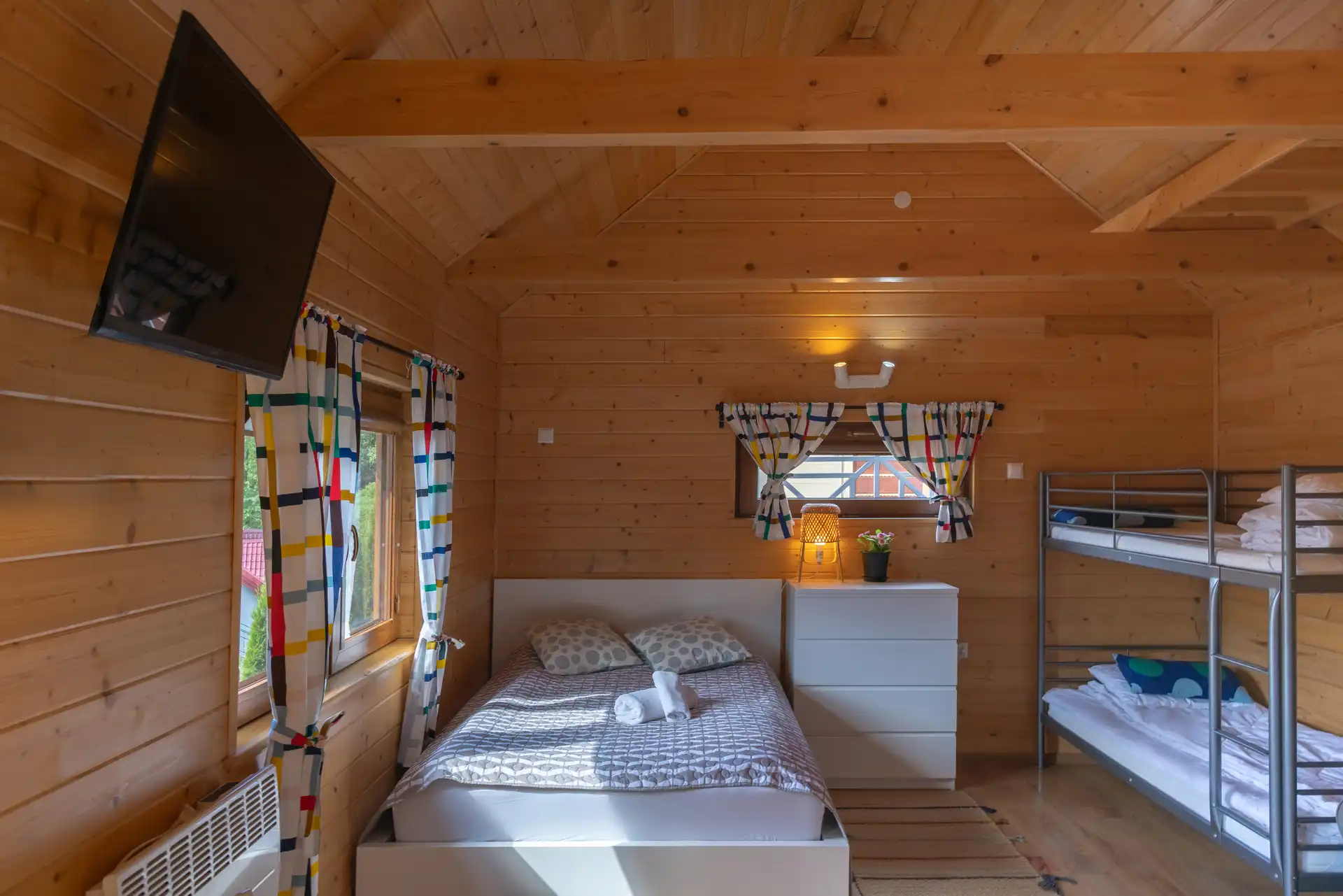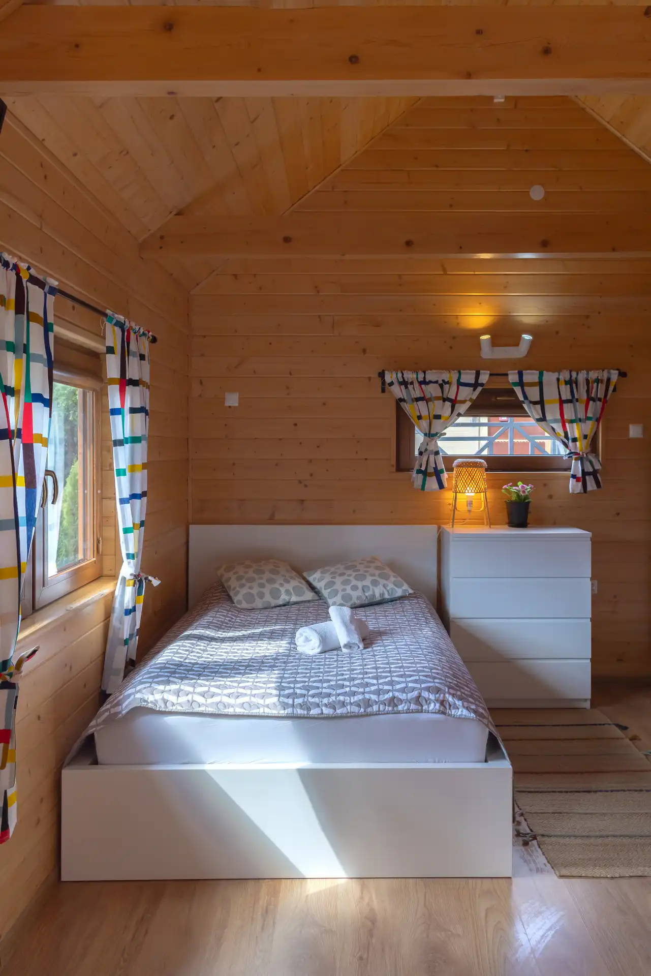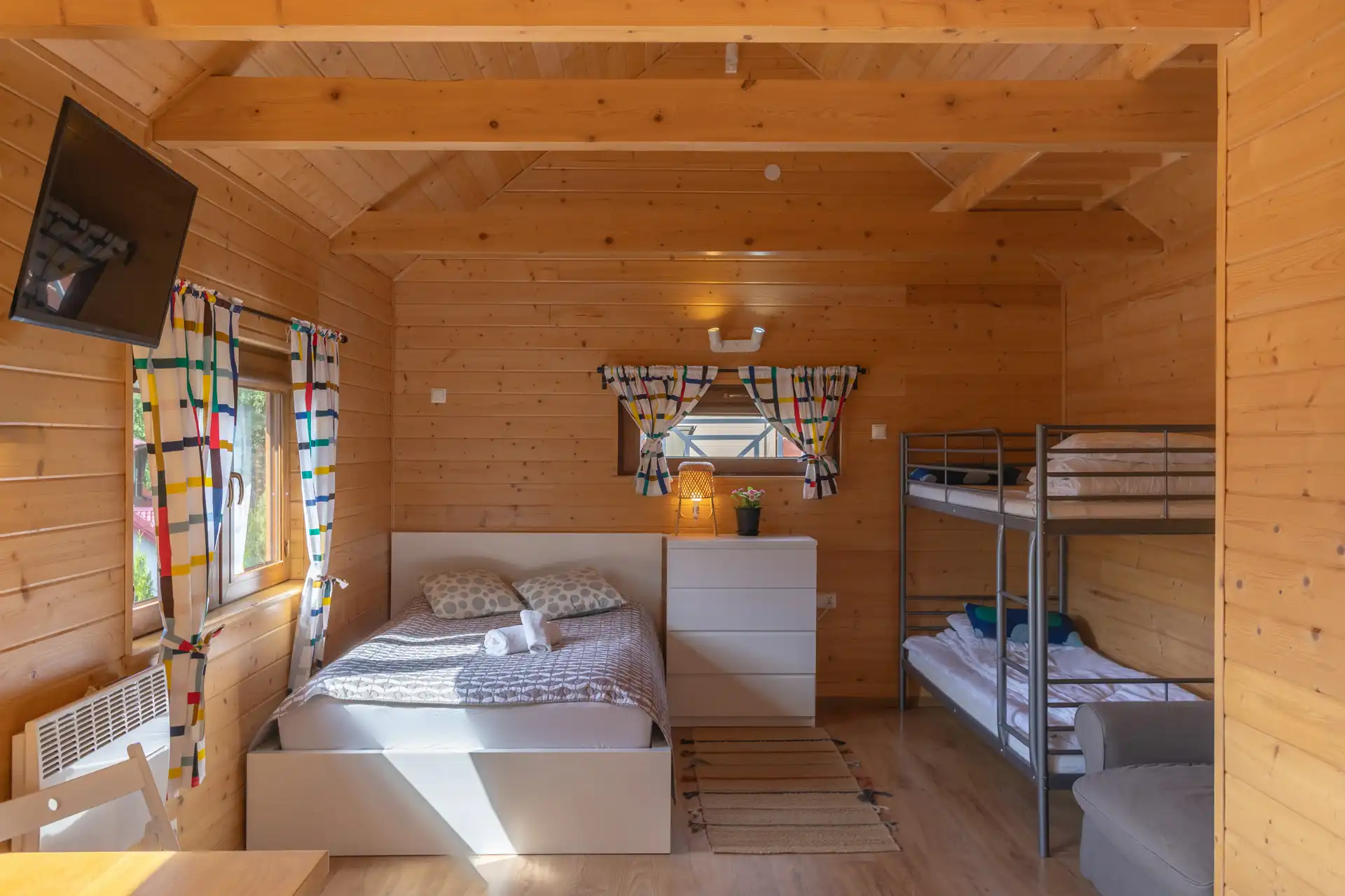 Domek Jaga nr 1 to 4-osobowa przestrzeń o powierzchni ~16 m², wyposażona w łazienkę, aneks kuchenny, klimatyzację i ogrzewanie. Kazdy domek posiada duże łóżko podwójne, łóżko piętrowe oraz dwa miejsca noclegowe na poddaszu.
