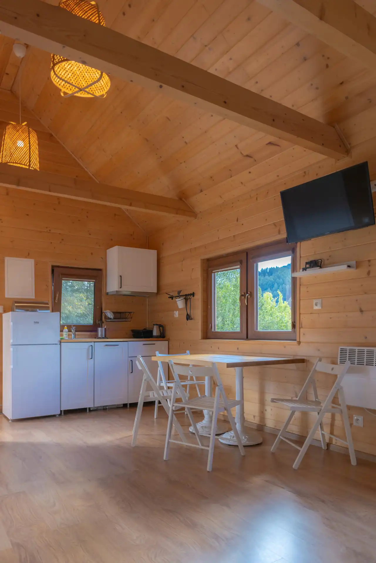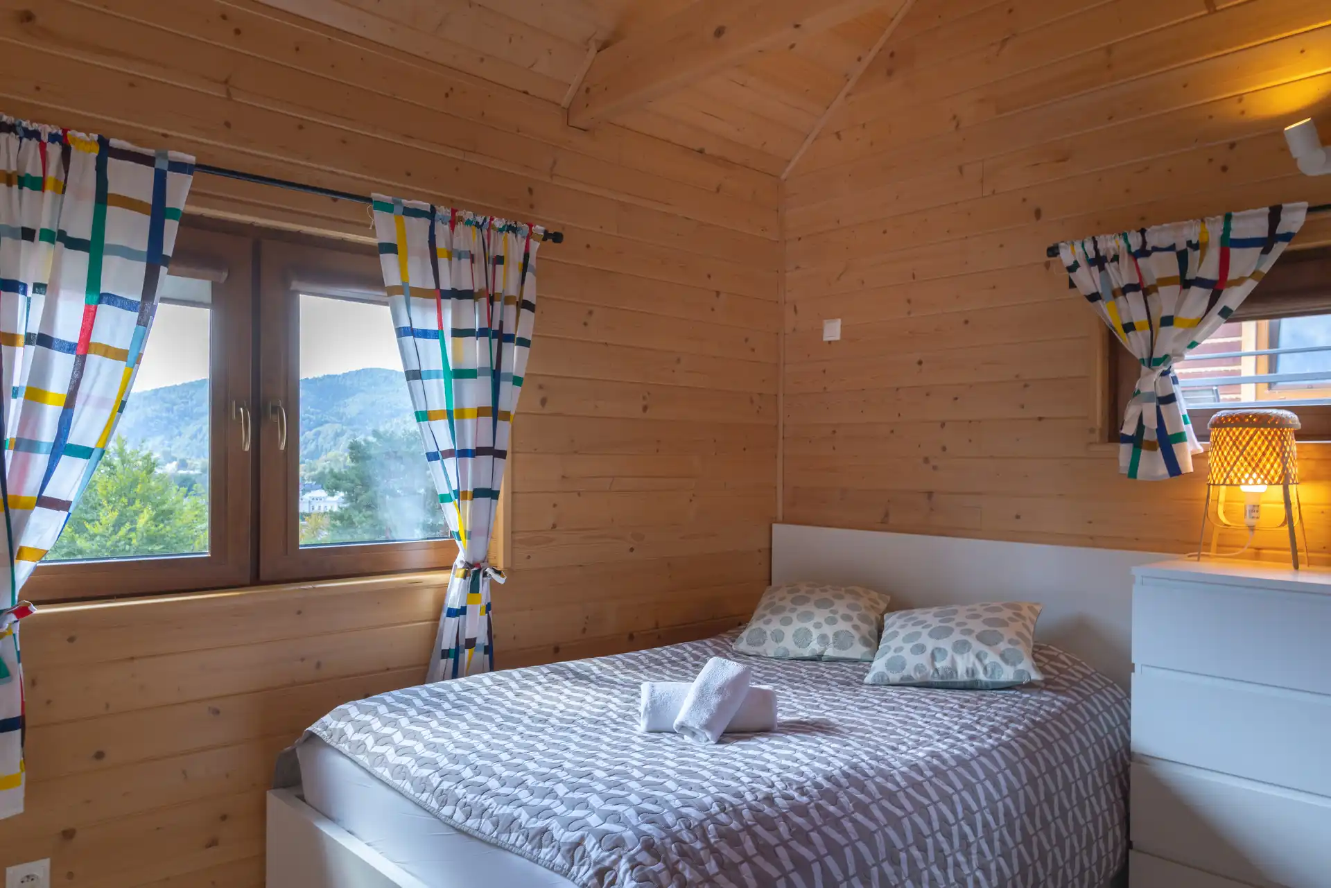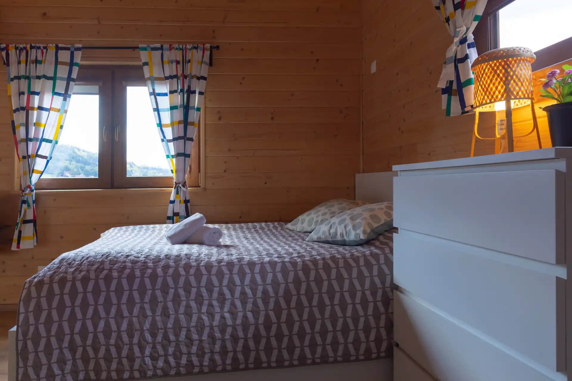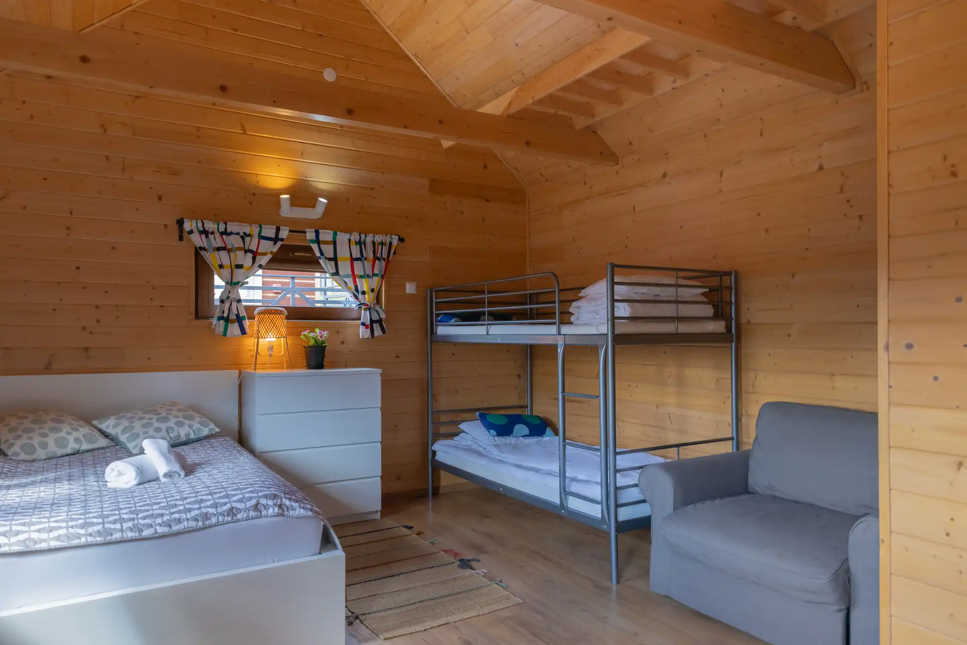 Domek Jaga nr 1 to 4-osobowa przestrzeń o powierzchni ~16 m², wyposażona w łazienkę, aneks kuchenny, klimatyzację i ogrzewanie. Kazdy domek posiada duże łóżko podwójne, łóżko piętrowe oraz dwa miejsca noclegowe na poddaszu.