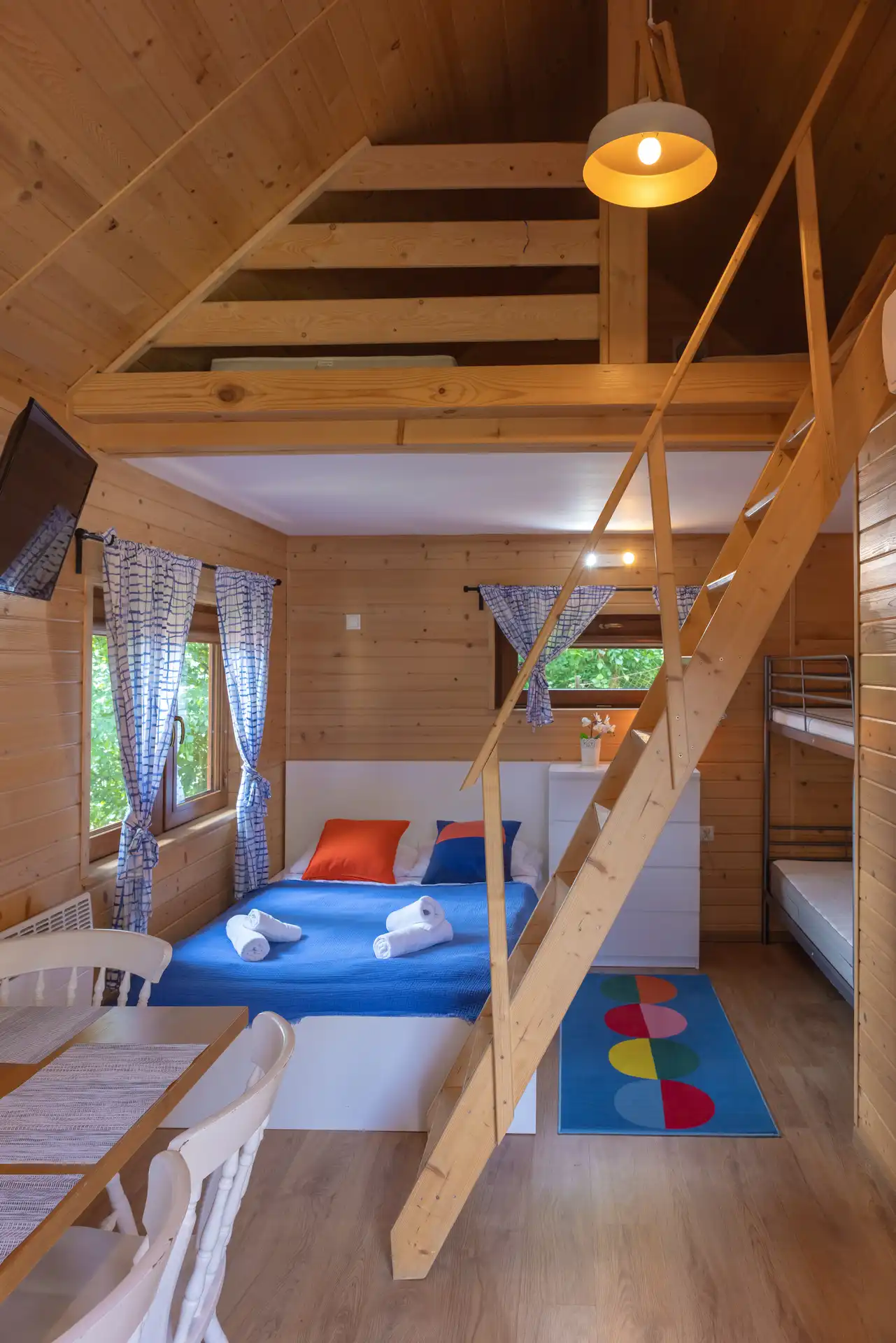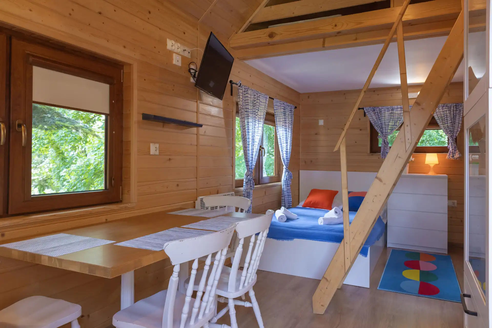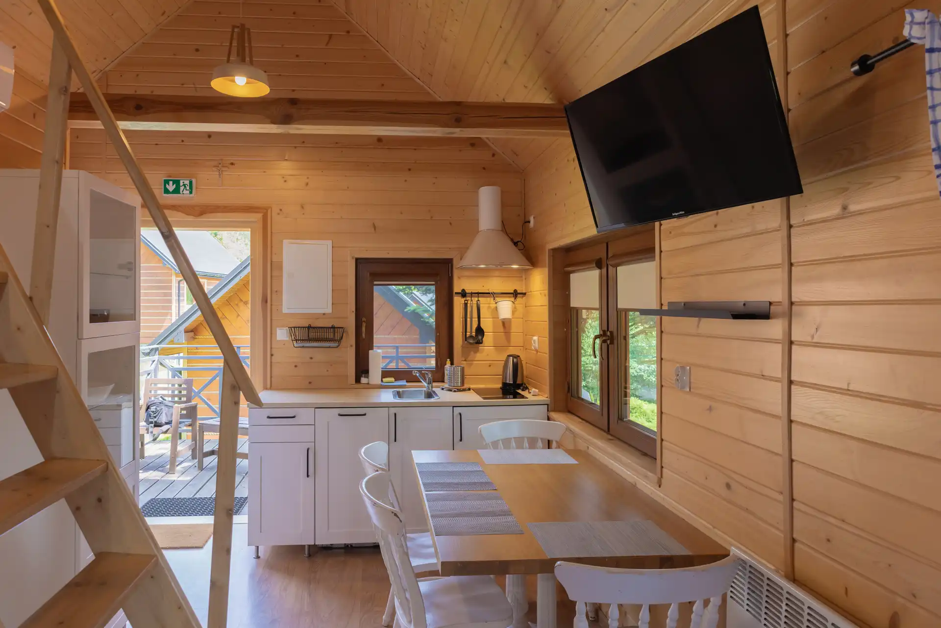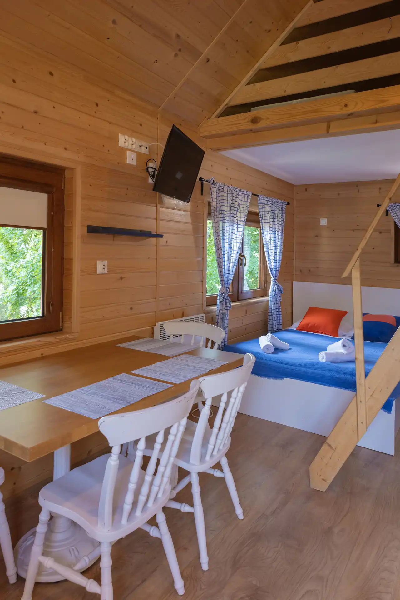 Domek Jaga nr 5 to 6-osobowa przestrzeń o powierzchni ~16 m², wyposażona w łazienkę, aneks kuchenny, klimatyzację i ogrzewanie. Kazdy domek posiada duże łóżko podwójne, łóżko piętrowe oraz dwa miejsca noclegowe na poddaszu.
