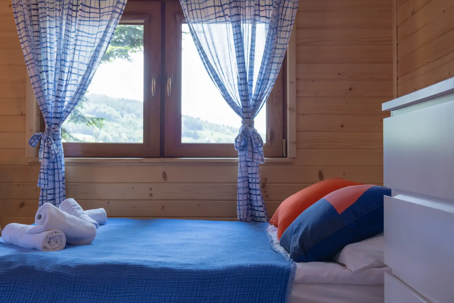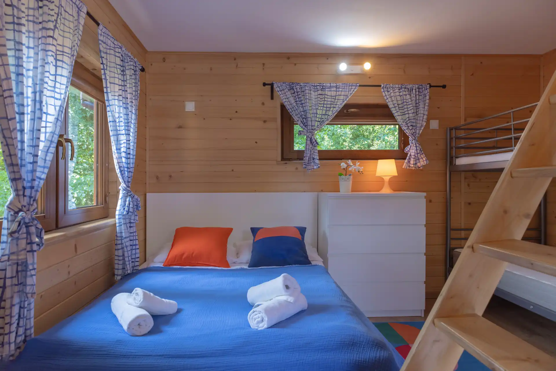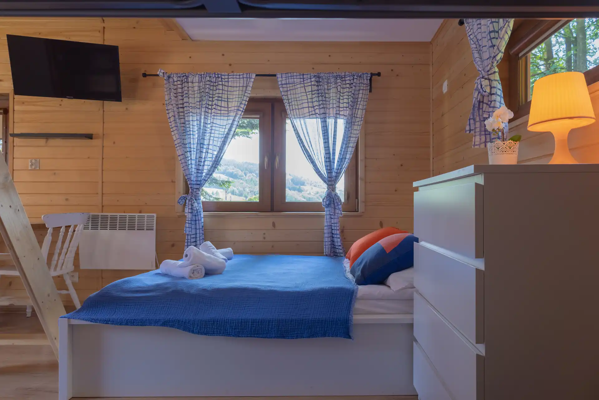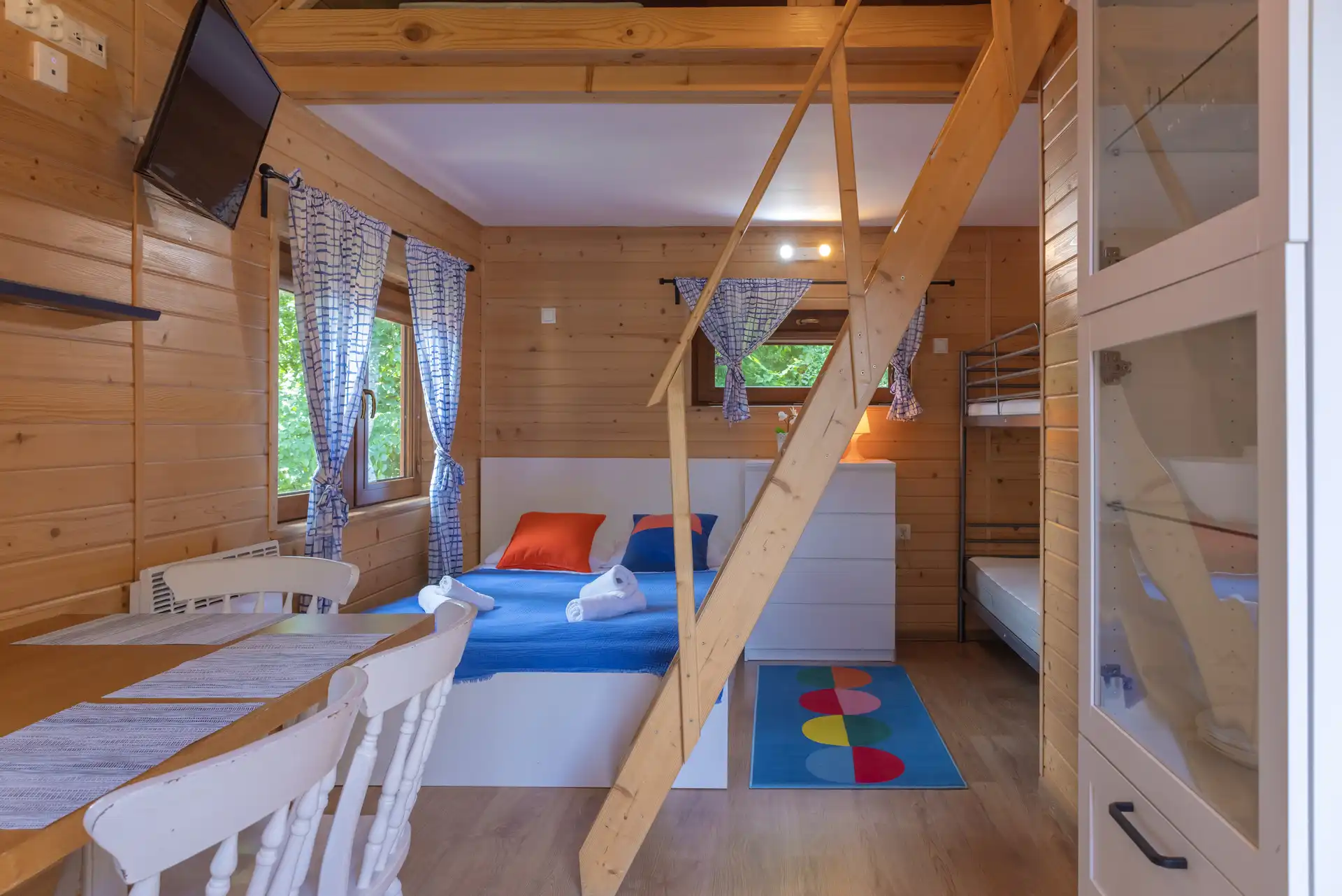 Domek Jaga nr 5 to 6-osobowa przestrzeń o powierzchni ~16 m², wyposażona w łazienkę, aneks kuchenny, klimatyzację i ogrzewanie. Kazdy domek posiada duże łóżko podwójne, łóżko piętrowe oraz dwa miejsca noclegowe na poddaszu.