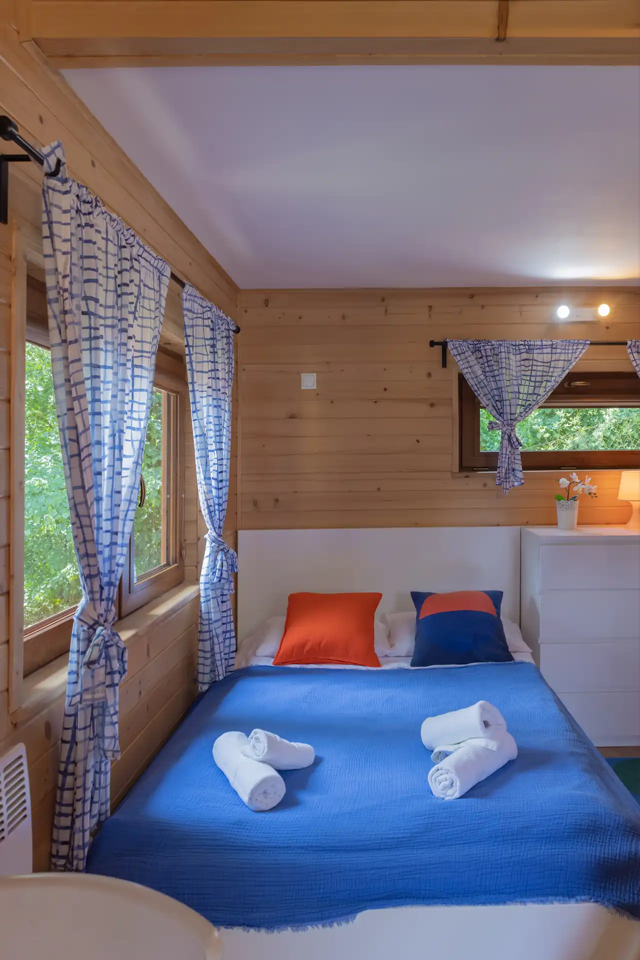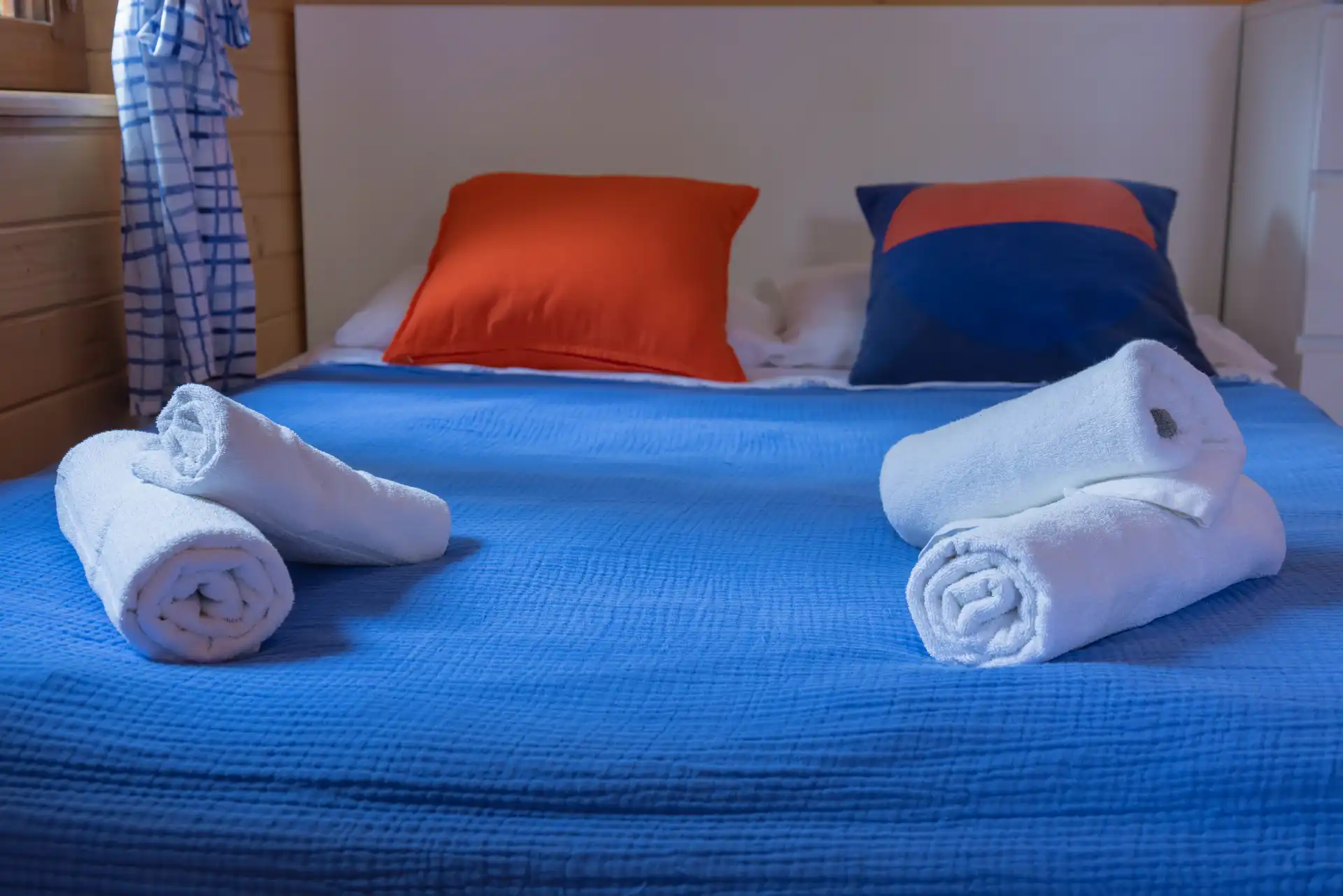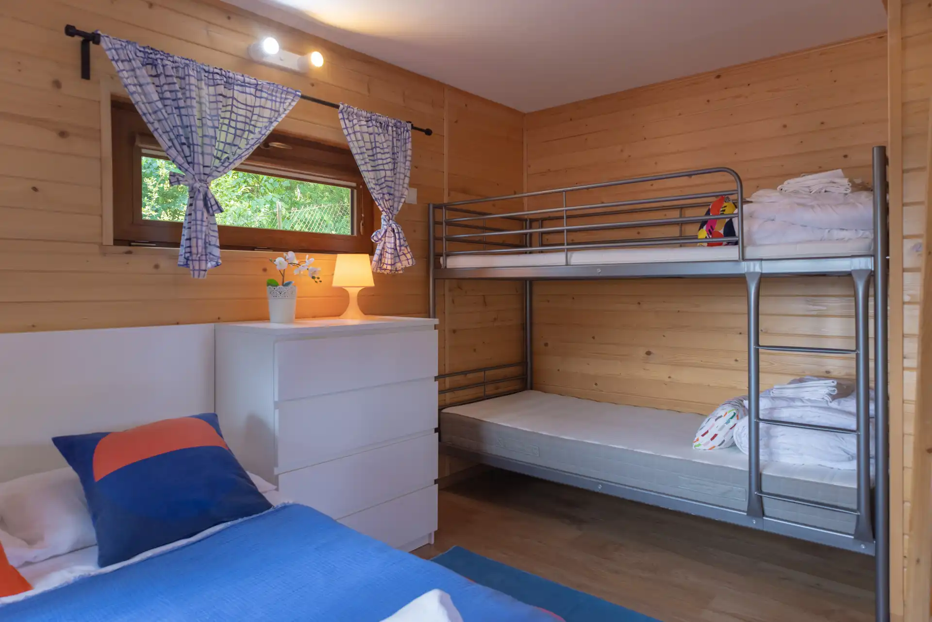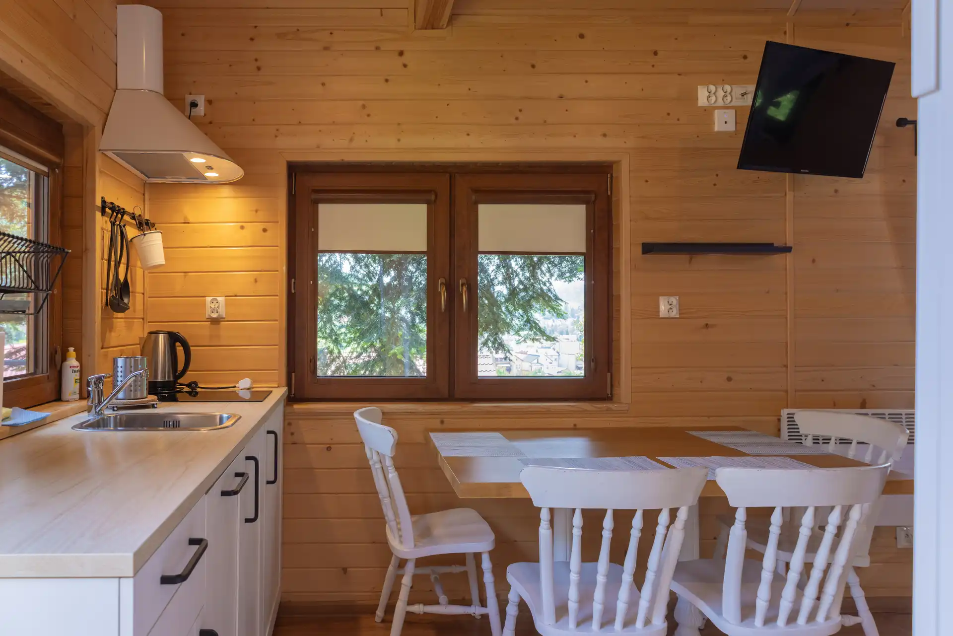 Domek Jaga nr 5 to 6-osobowa przestrzeń o powierzchni ~16 m², wyposażona w łazienkę, aneks kuchenny, klimatyzację i ogrzewanie. Kazdy domek posiada duże łóżko podwójne, łóżko piętrowe oraz dwa miejsca noclegowe na poddaszu.