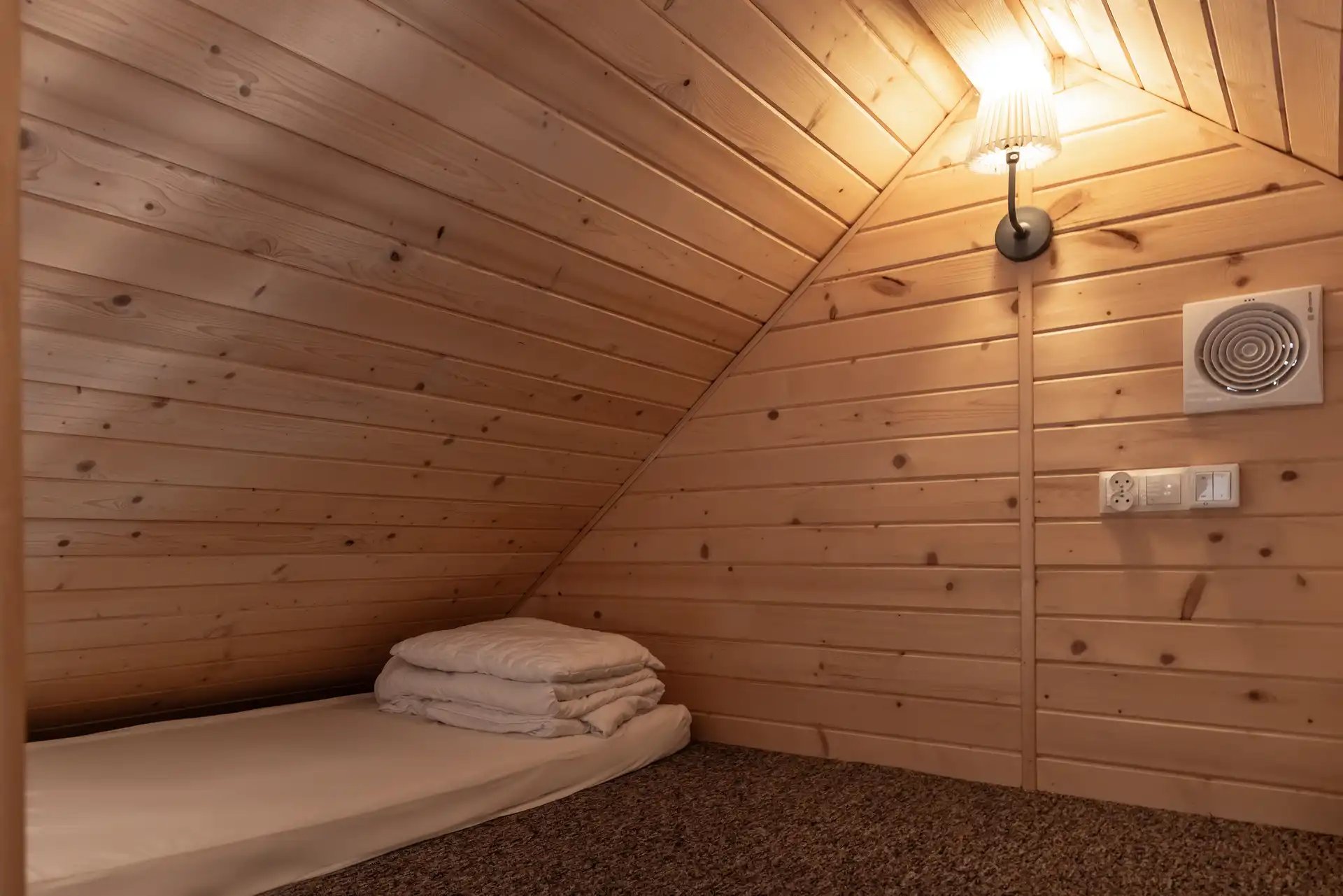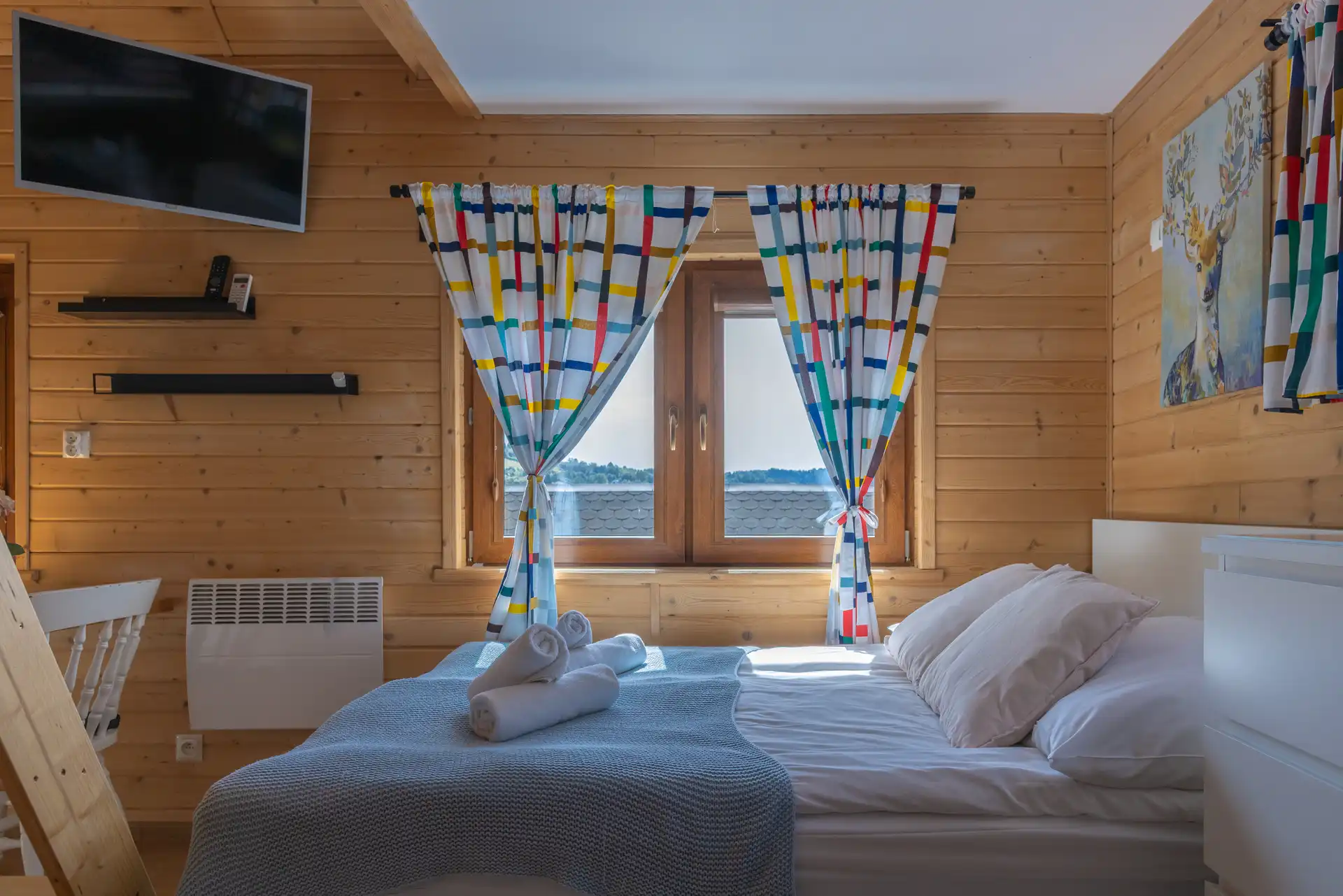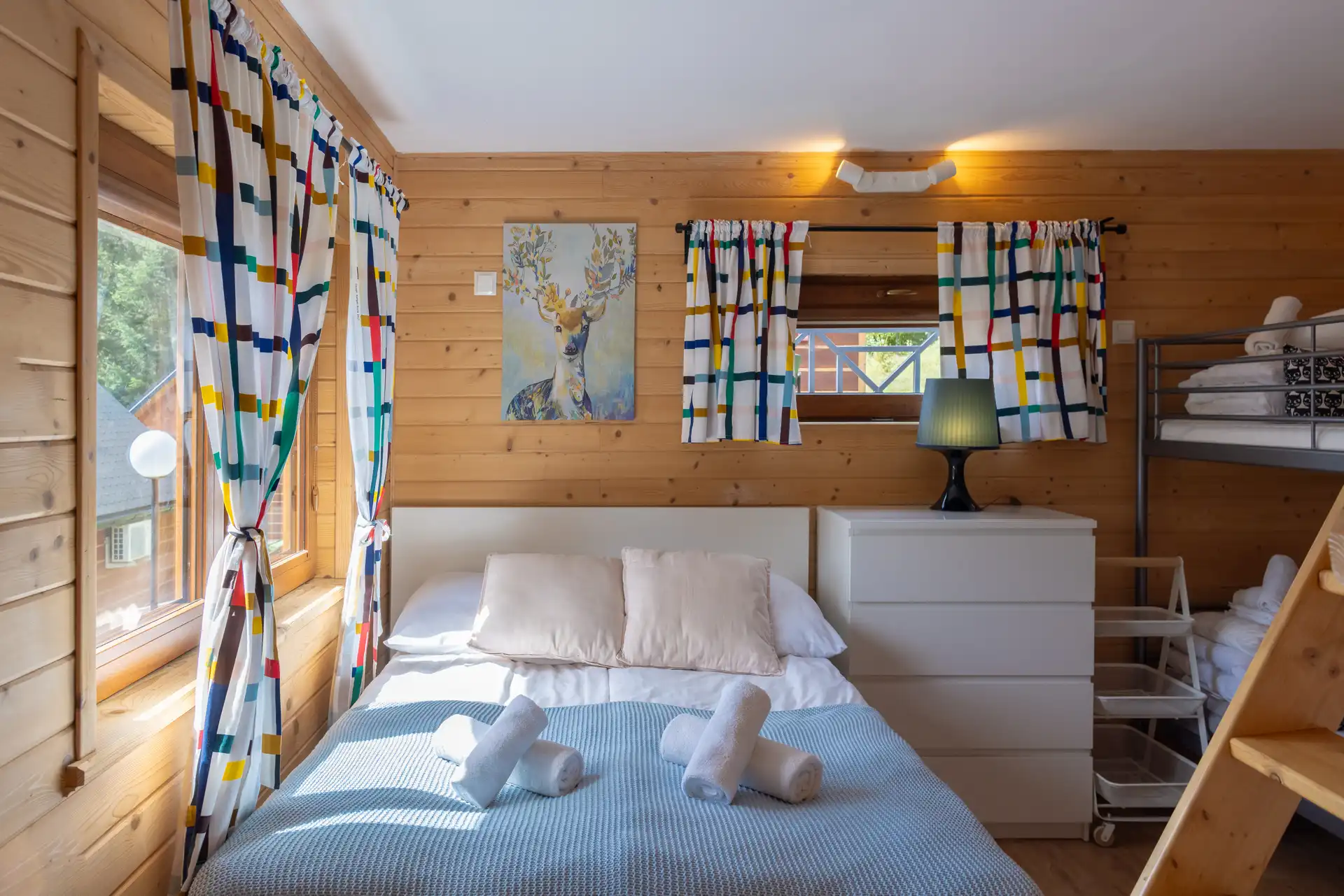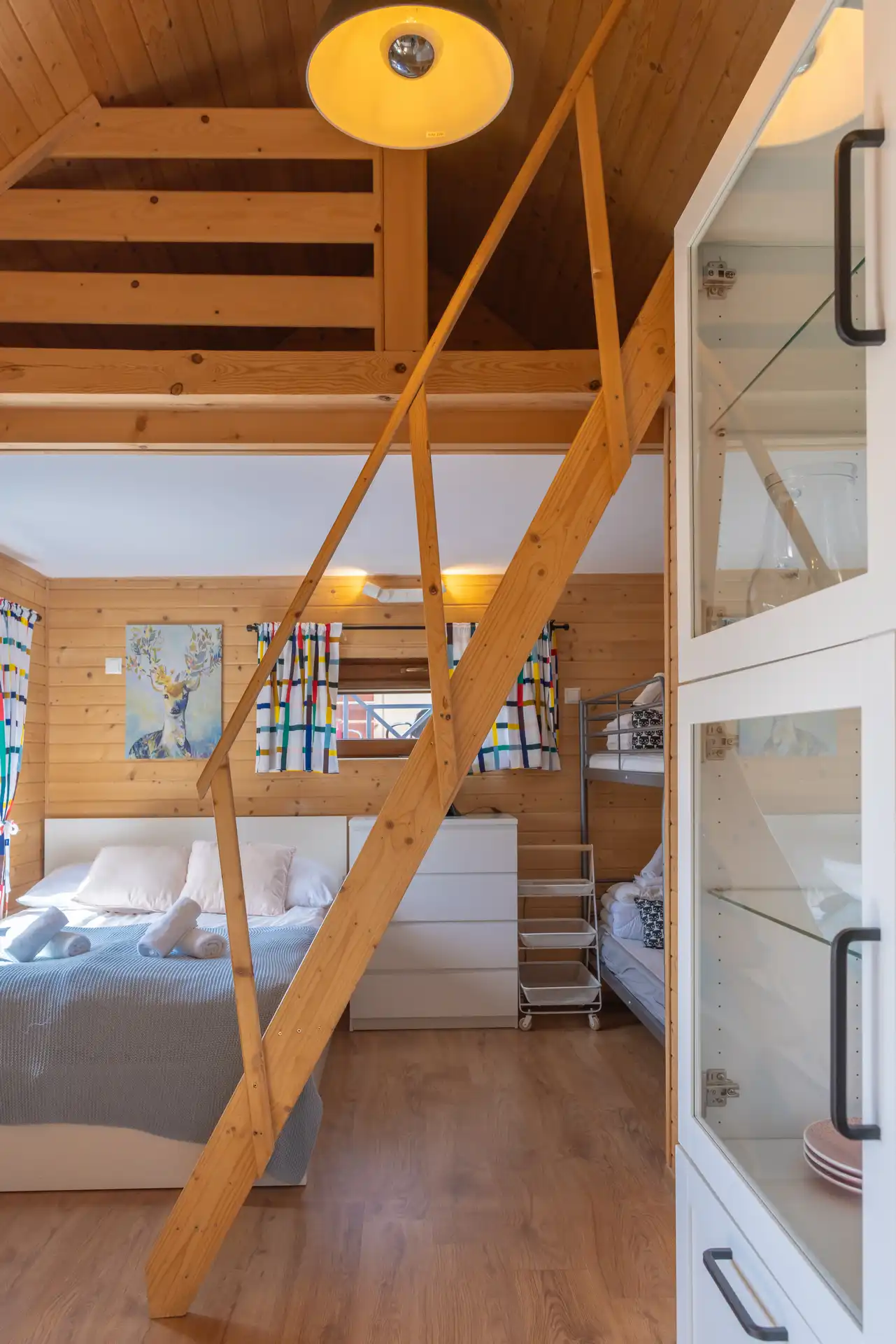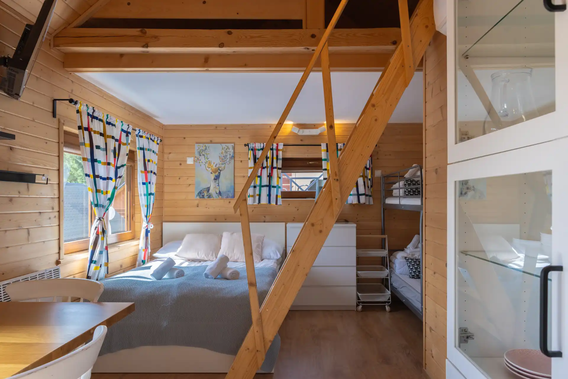 Domek Jaga nr 6 to 6-osobowa przestrzeń o powierzchni ~16 m², wyposażona w łazienkę, aneks kuchenny, klimatyzację i ogrzewanie. Kazdy domek posiada duże łóżko podwójne, łóżko piętrowe oraz dwa miejsca noclegowe na poddaszu.