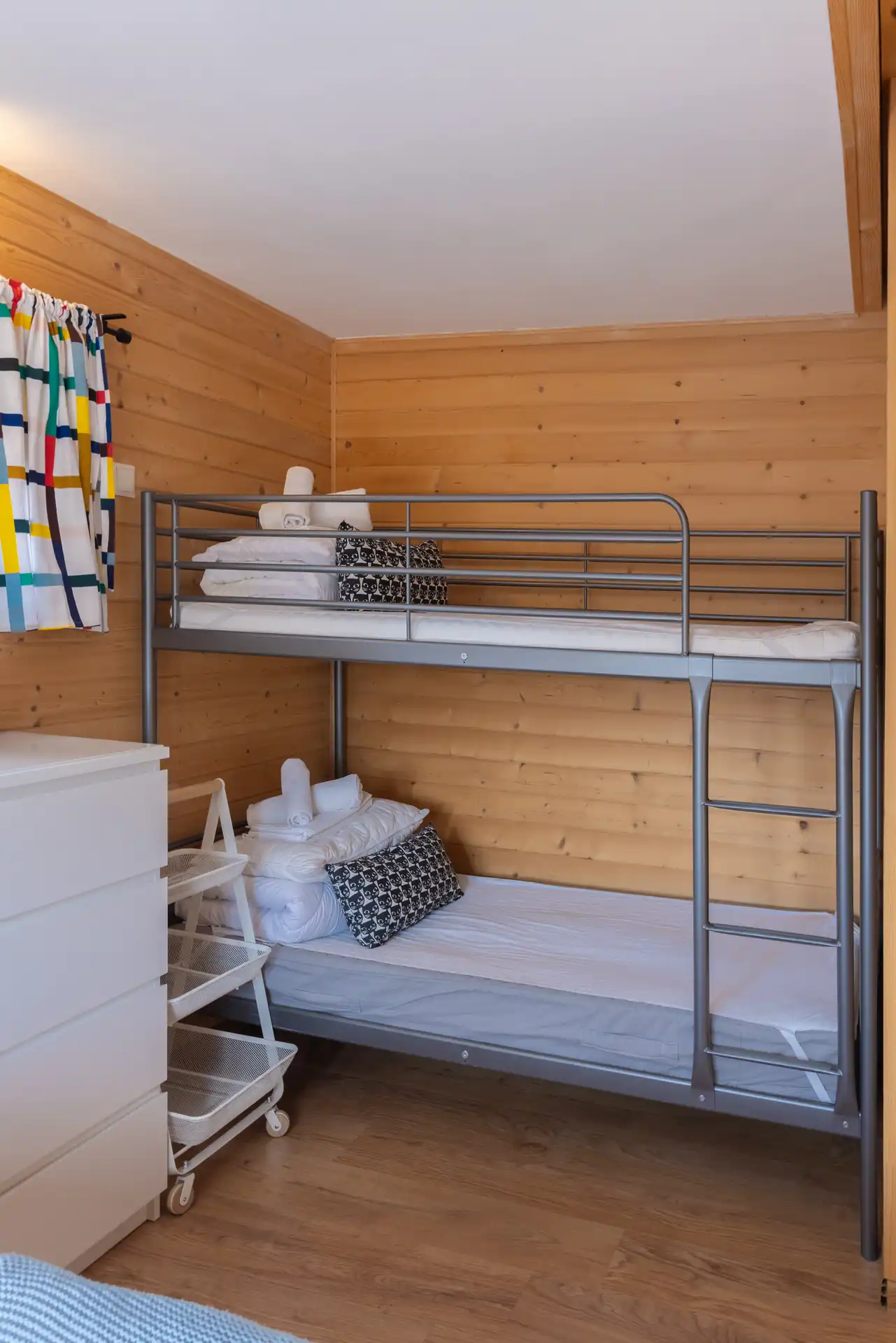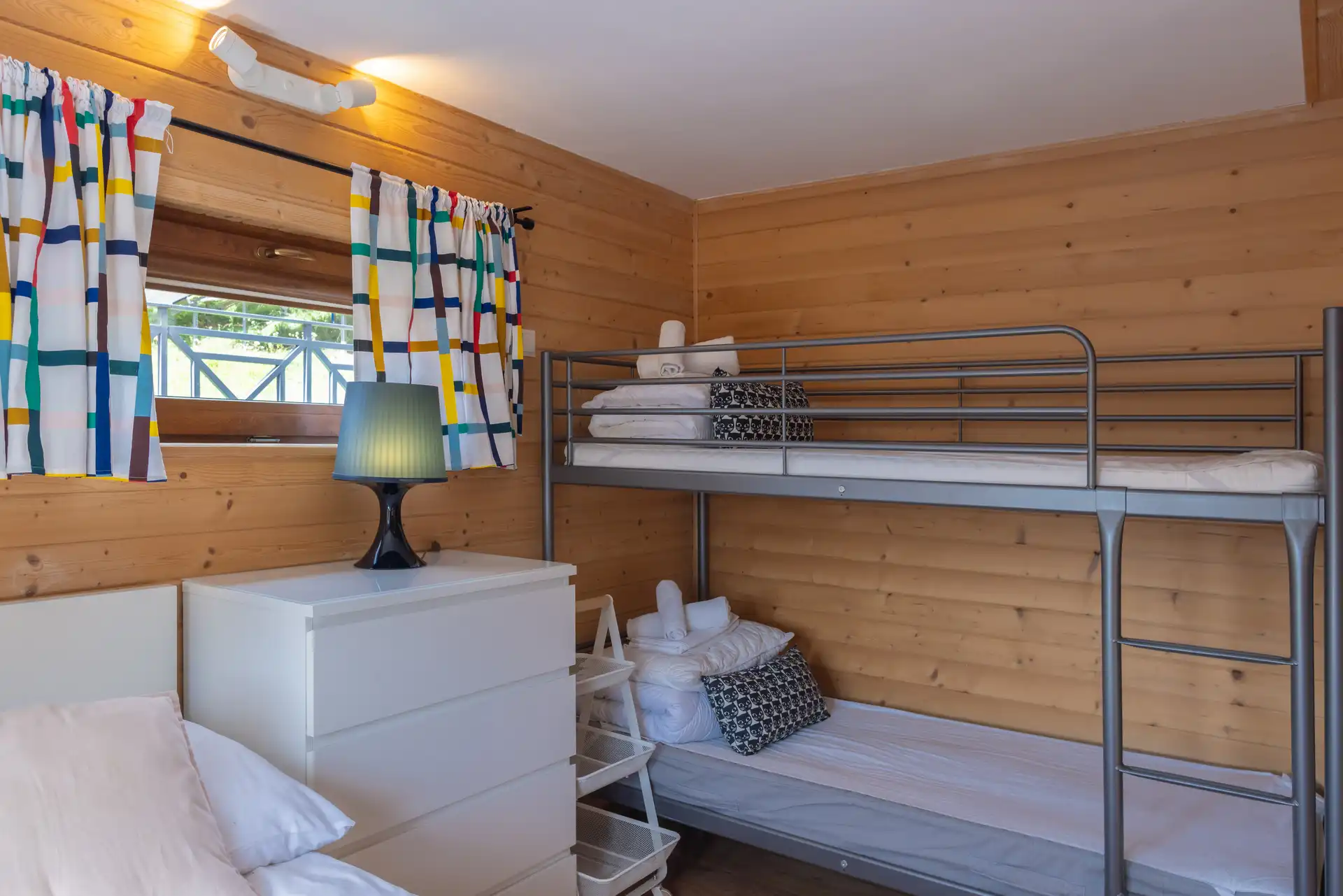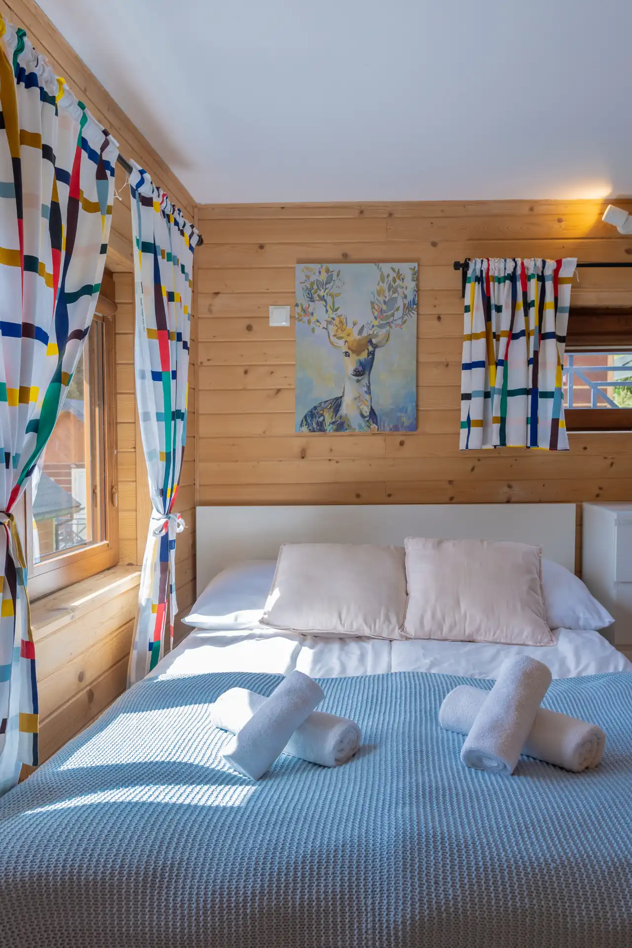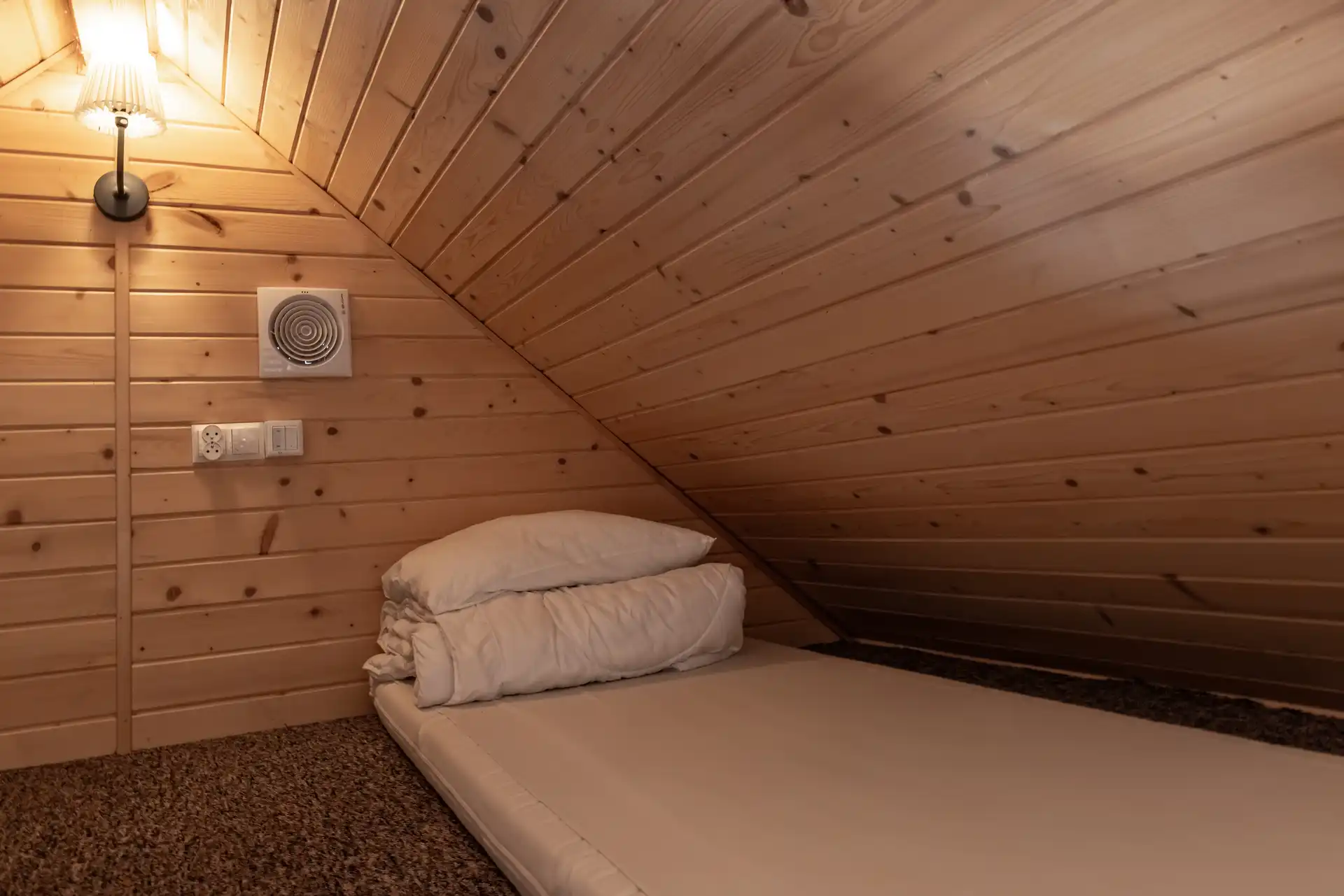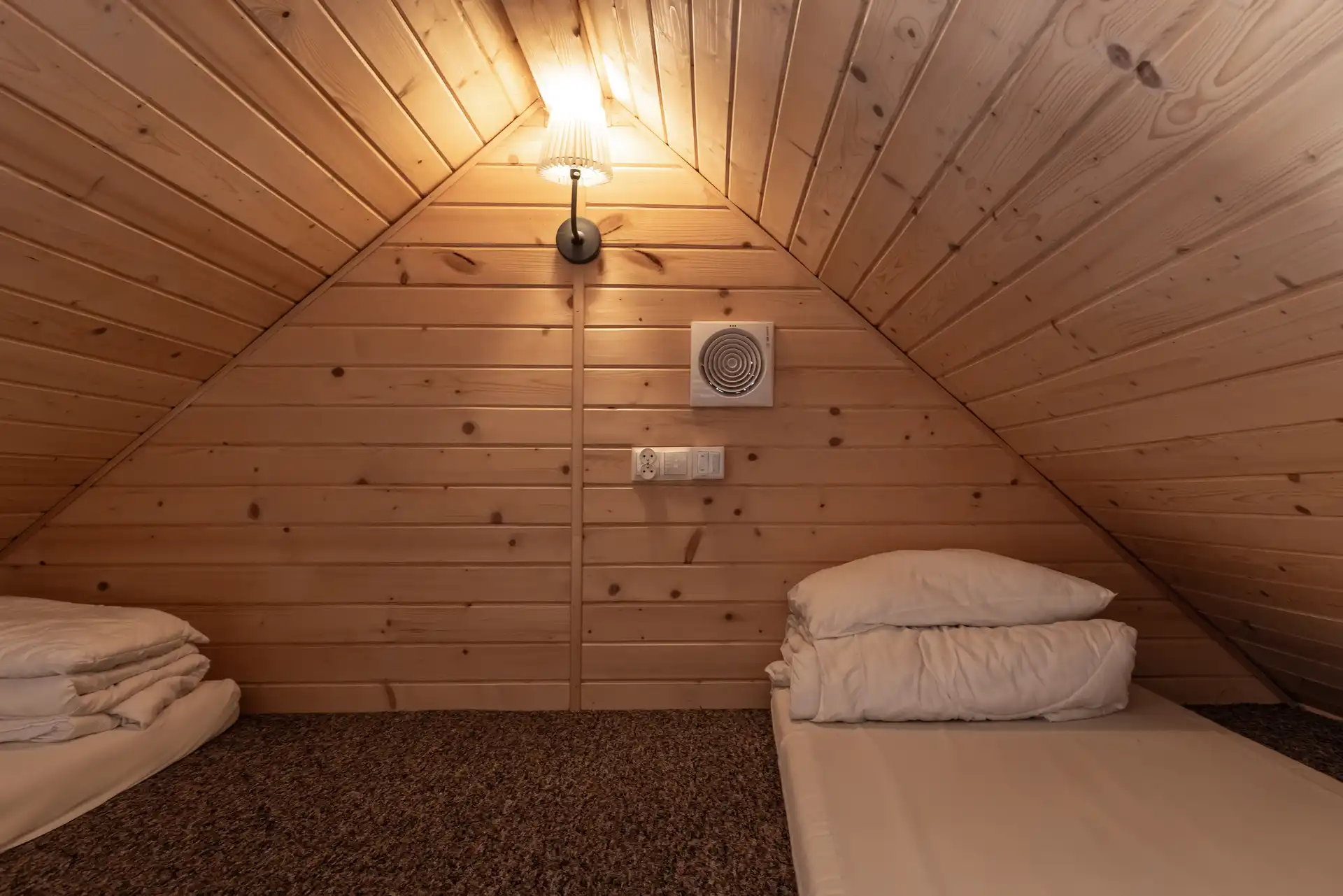 Domek Jaga nr 6 to 6-osobowa przestrzeń o powierzchni ~16 m², wyposażona w łazienkę, aneks kuchenny, klimatyzację i ogrzewanie. Kazdy domek posiada duże łóżko podwójne, łóżko piętrowe oraz dwa miejsca noclegowe na poddaszu.