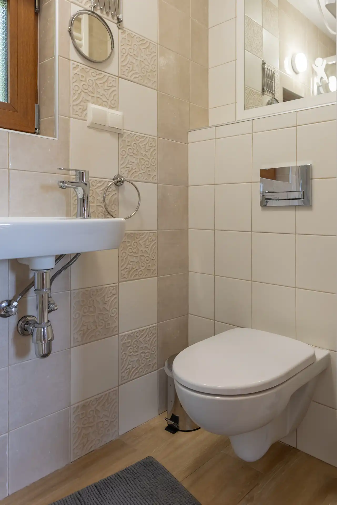 Ponadto znajdziesz tu lodówkę, zmywarkę, płytę indukcyjną, sztućce i pełną zastawę stołową. W domku jest również w pełni wyposażona i funkcjonalna łazienka z kabiną prysznicową, umywalką i toaletą.
