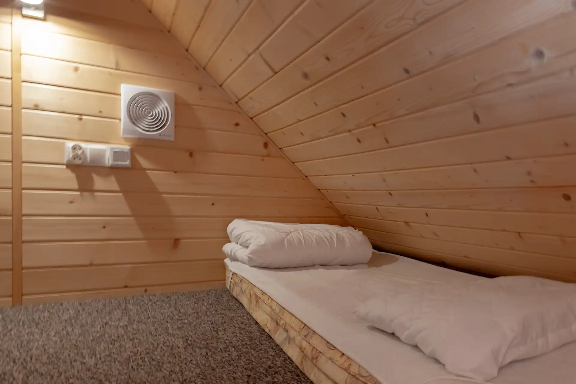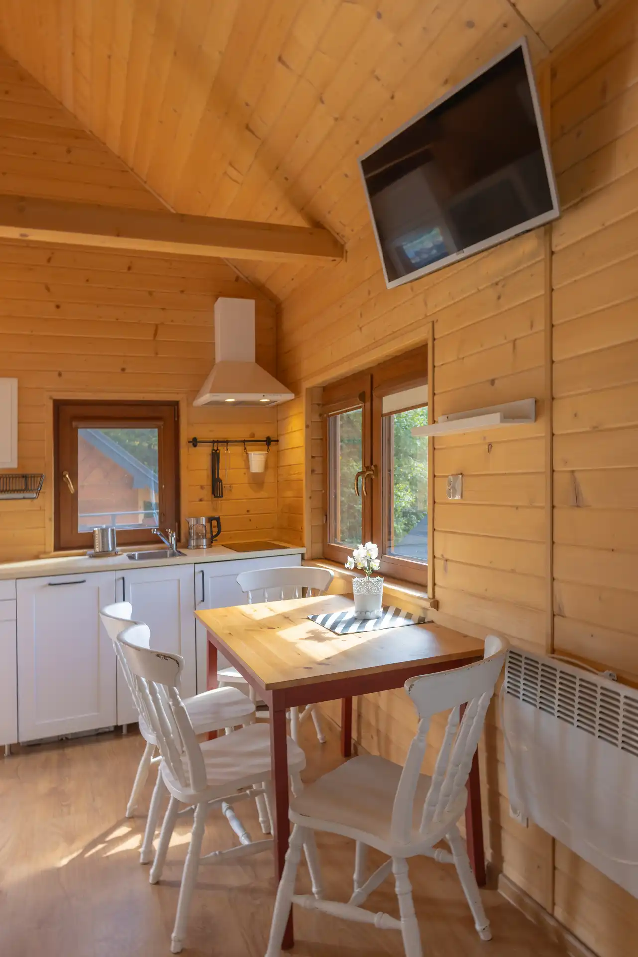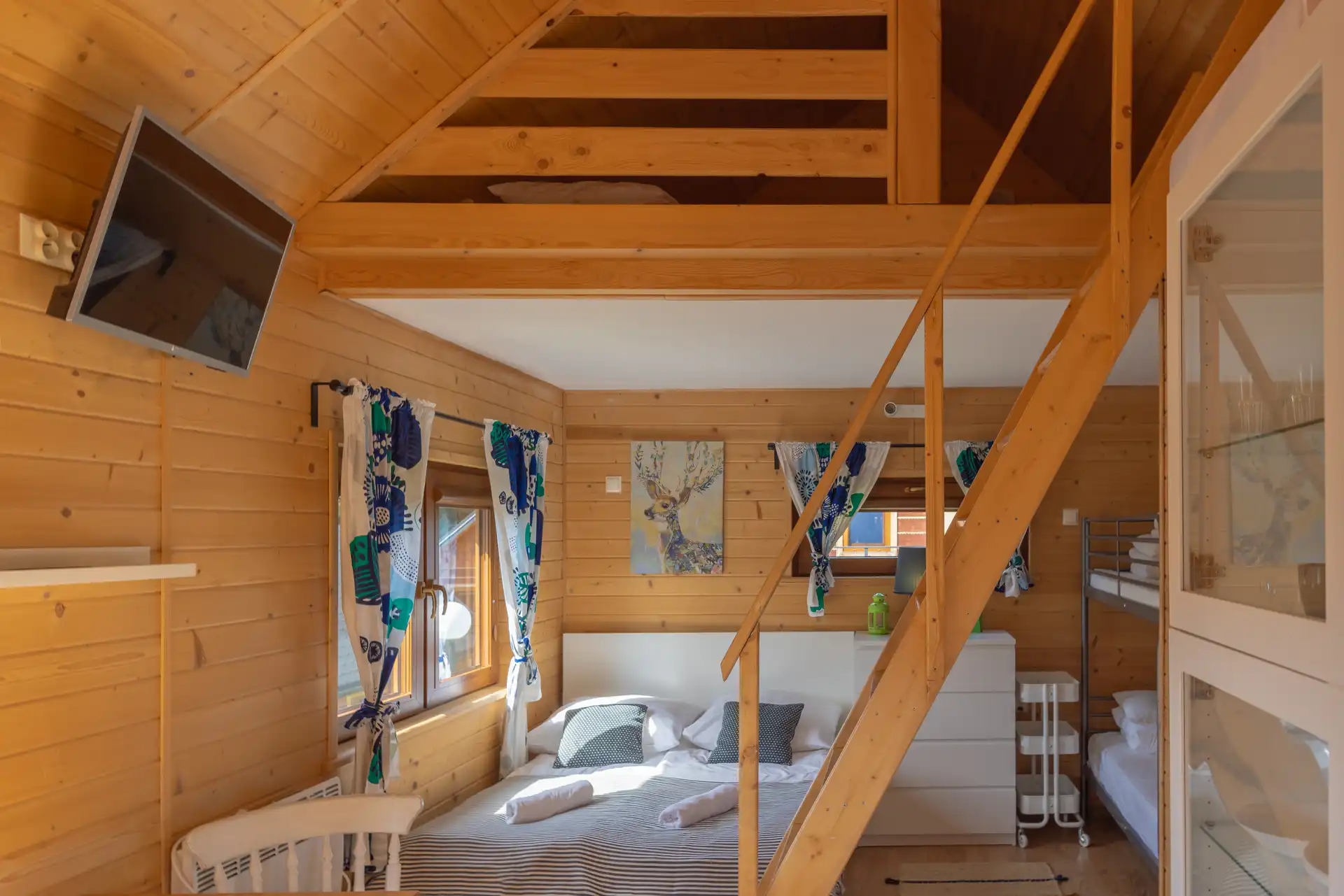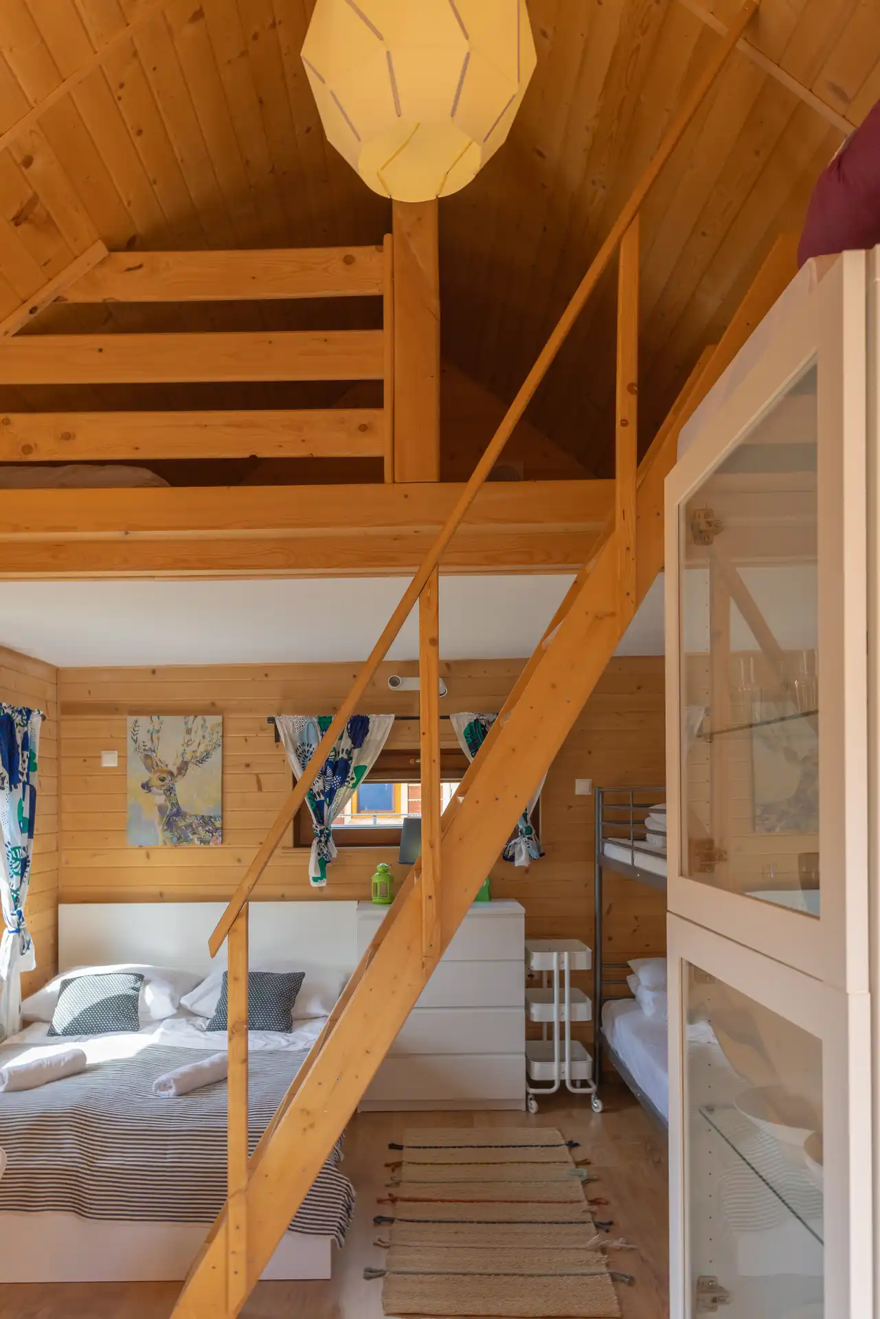 Domek Jaga nr 7 to 6-osobowa przestrzeń o powierzchni ~16 m², wyposażona w łazienkę, aneks kuchenny, klimatyzację i ogrzewanie. Kazdy domek posiada duże łóżko podwójne, łóżko piętrowe oraz dwa miejsca noclegowe na poddaszu.