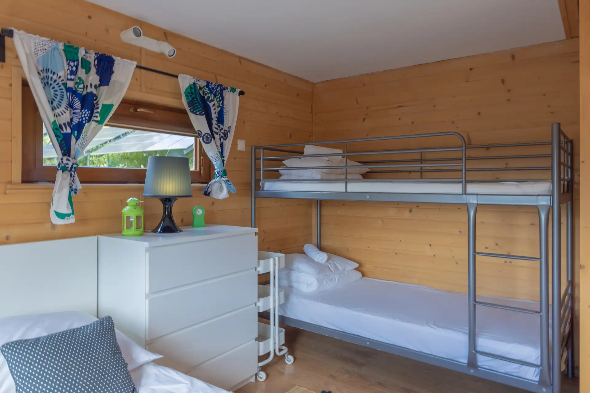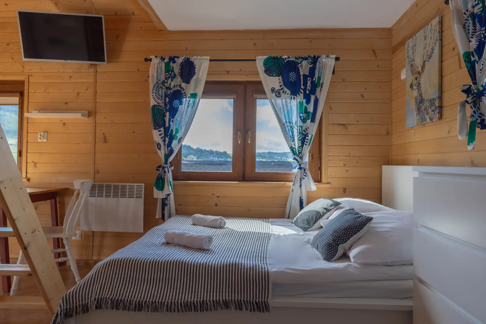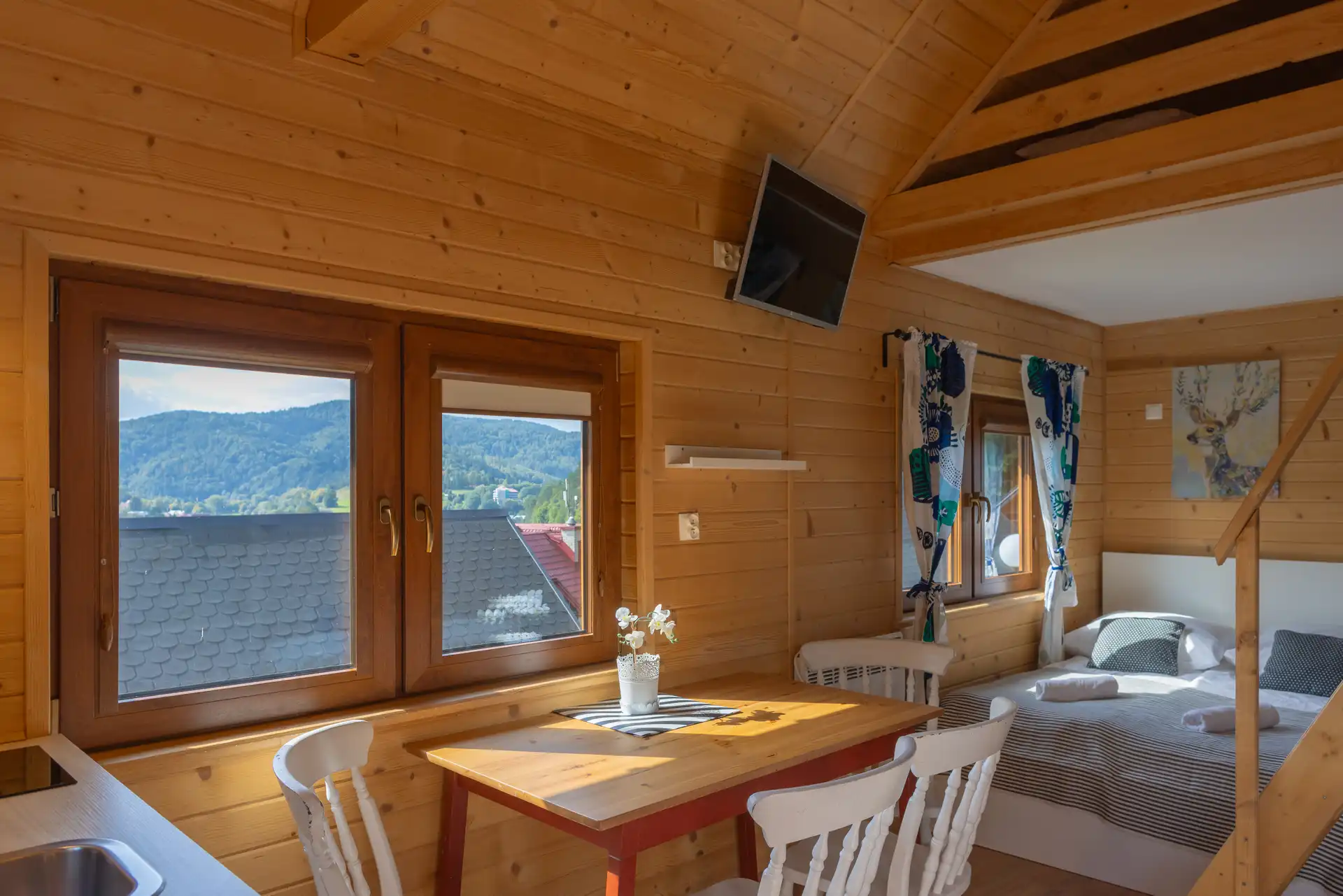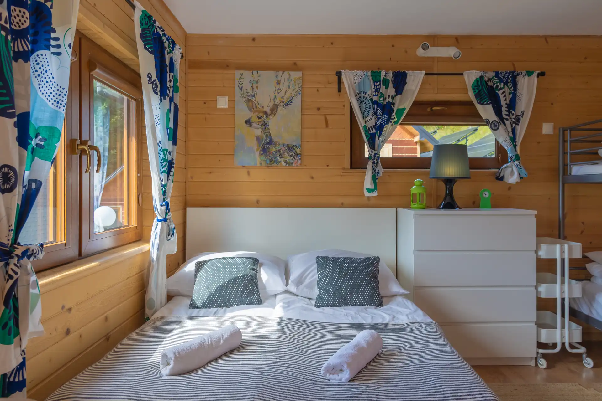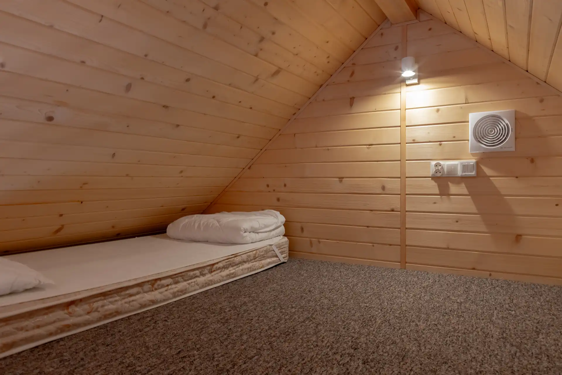 Domek Jaga nr 7 to 6-osobowa przestrzeń o powierzchni ~16 m², wyposażona w łazienkę, aneks kuchenny, klimatyzację i ogrzewanie. Kazdy domek posiada duże łóżko podwójne, łóżko piętrowe oraz dwa miejsca noclegowe na poddaszu.