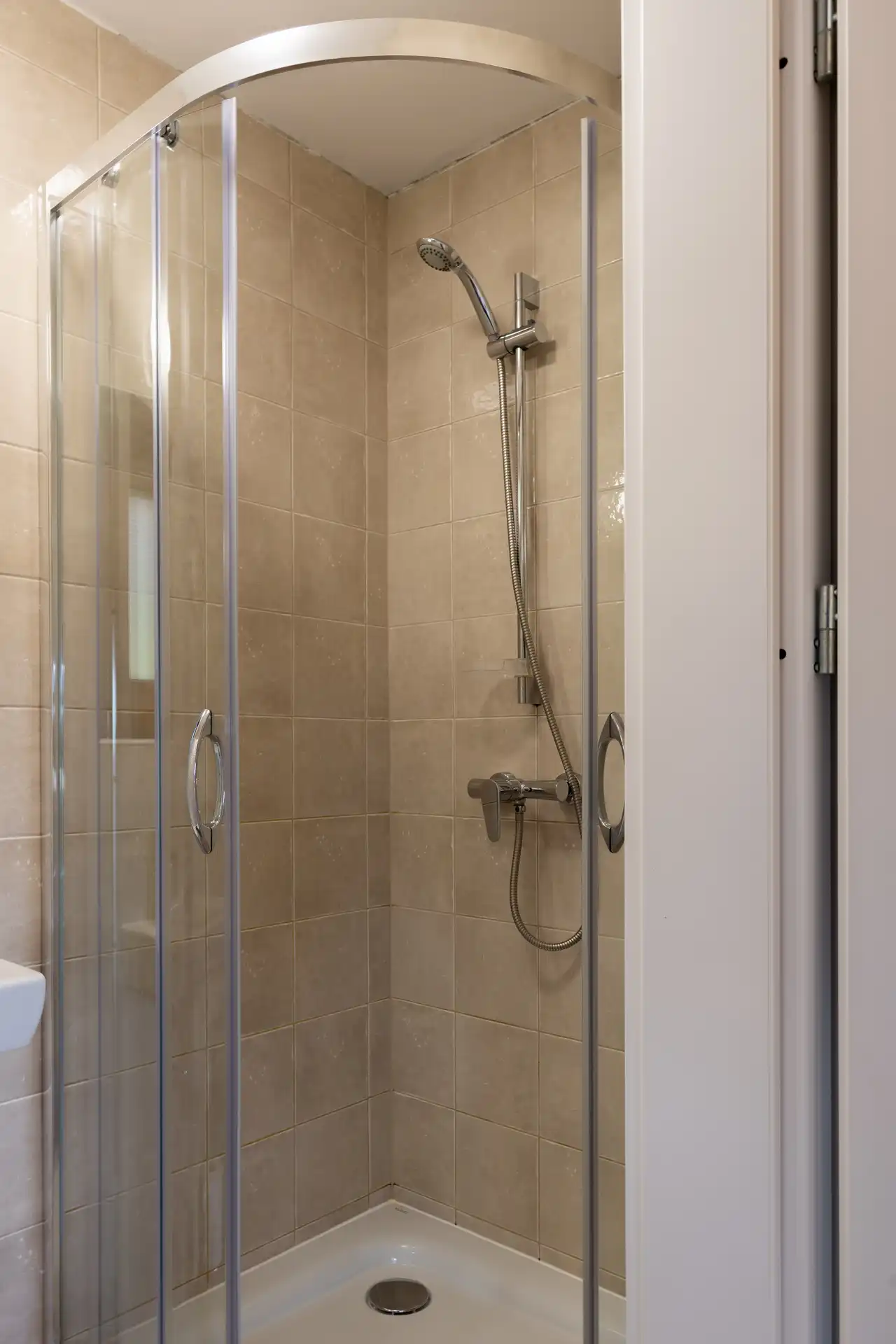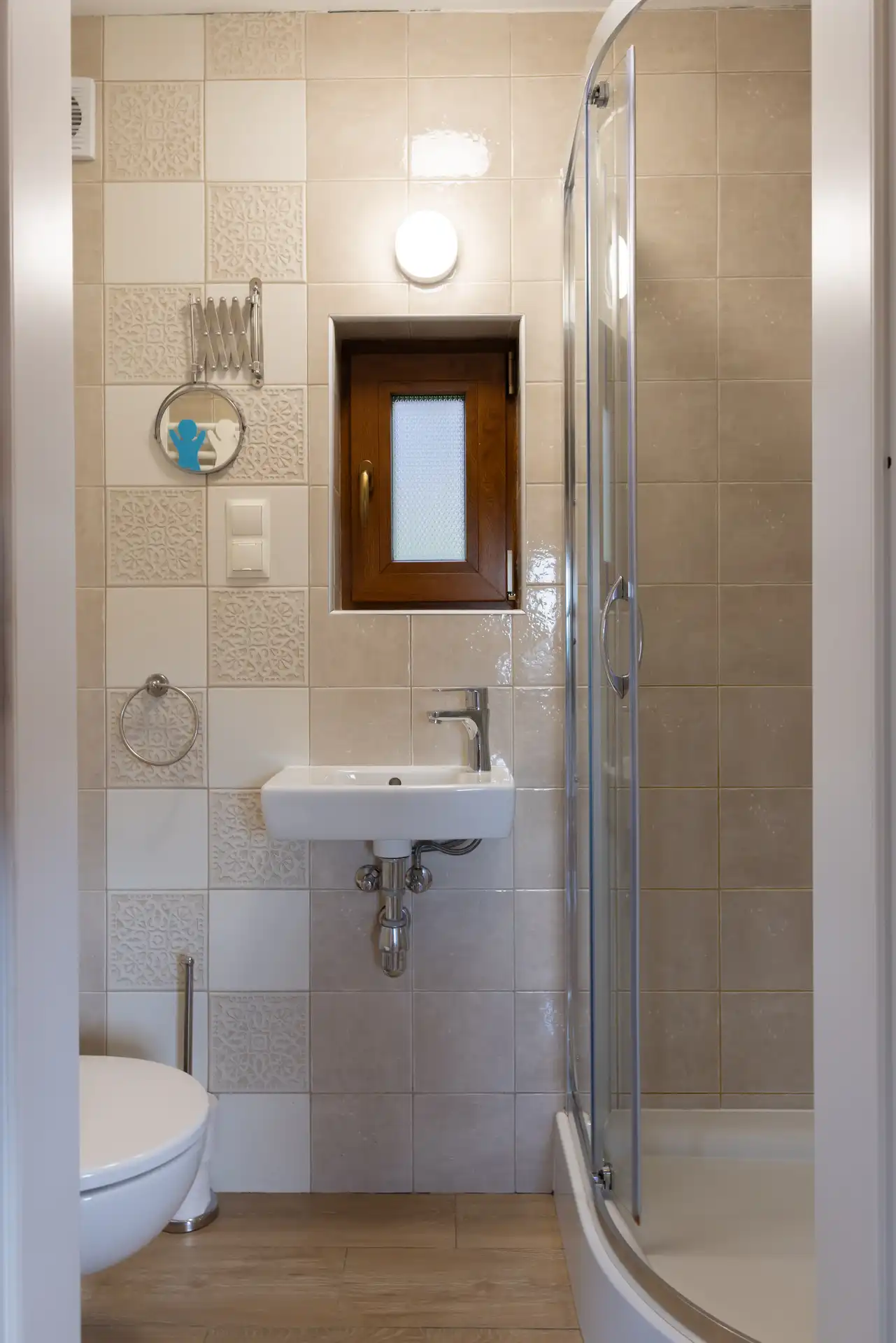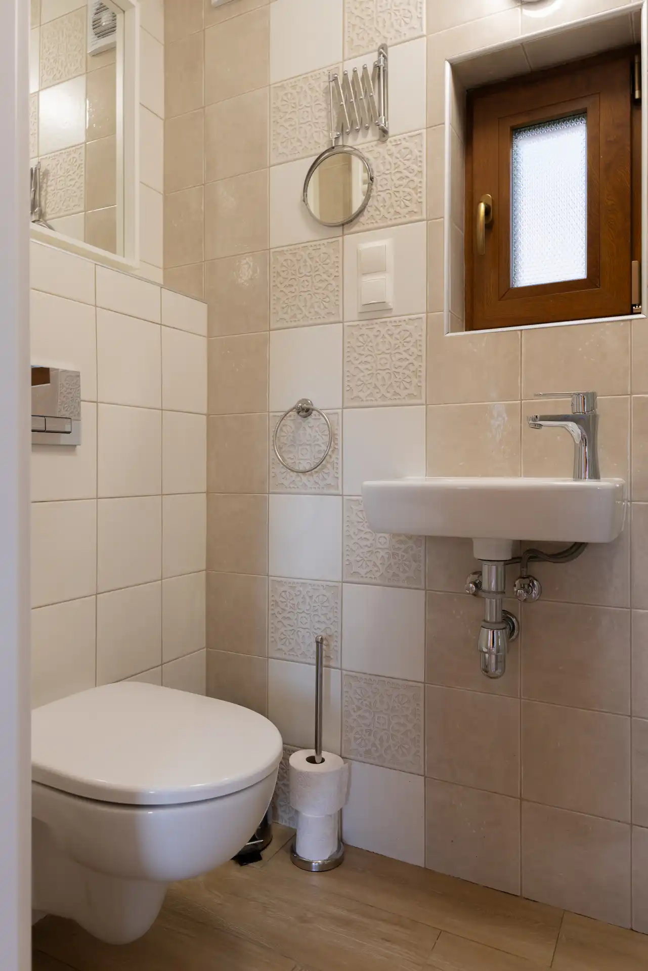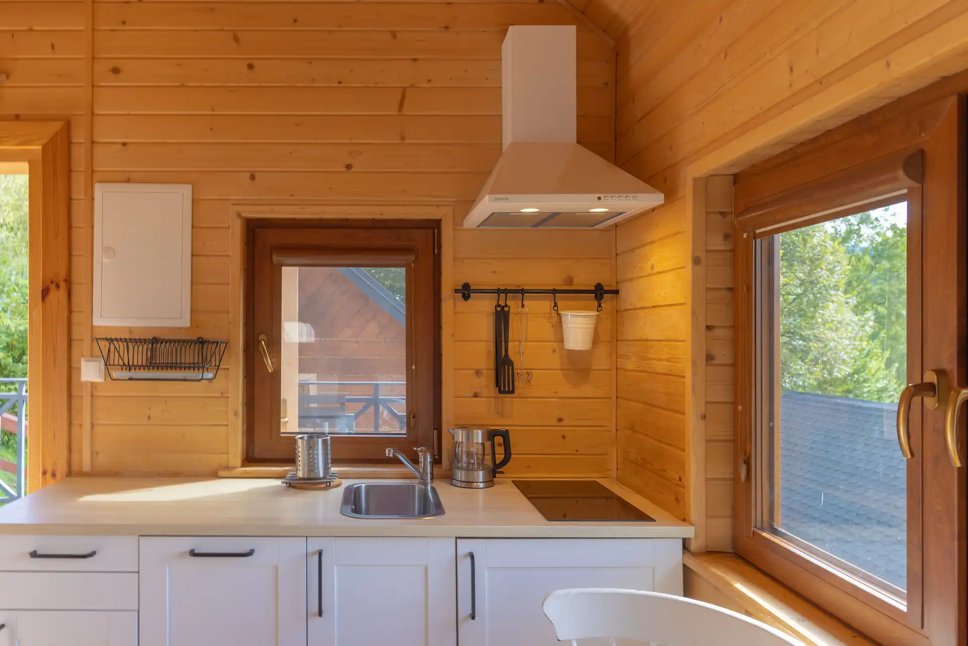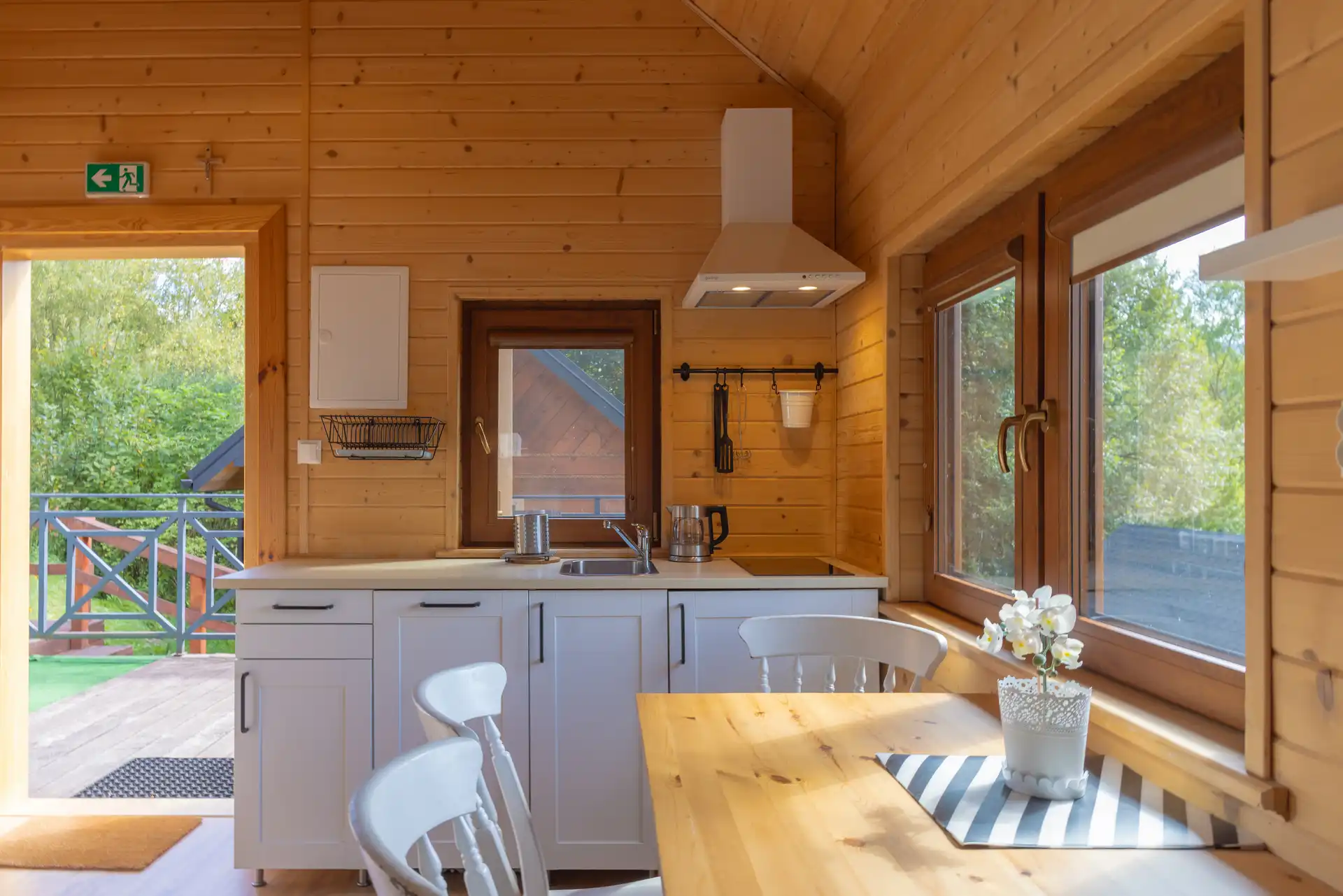 Ponadto znajdziesz tu lodówkę, zmywarkę, płytę indukcyjną, sztućce i pełną zastawę stołową. W domku jest również w pełni wyposażona i funkcjonalna łazienka z kabiną prysznicową, umywalką i toaletą.